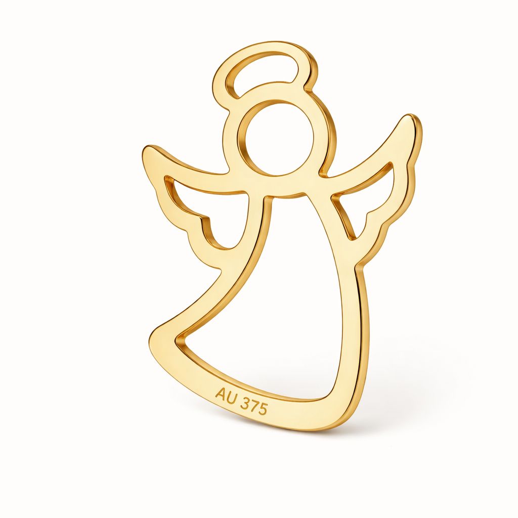 The openwork angel connector made of AU 375 gold is a precise jewelry component with a light and decorative form. The symbol of protection suits commemorative, religious, and personalized jewelry designs.