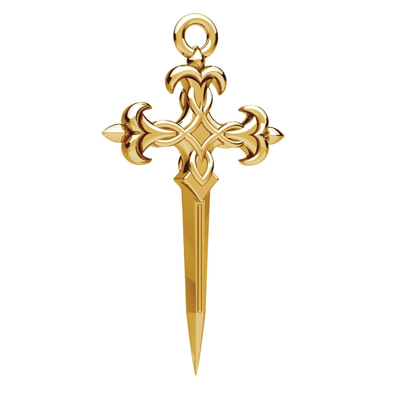 The dagger cross pendant is a bold decorative motif with symbolic character. The brass casting combines the form of a cross, sword and dagger, enhanced with a fleur-de-lis detail. The deep structure highlights the design. Intended mainly for necklaces and earrings.